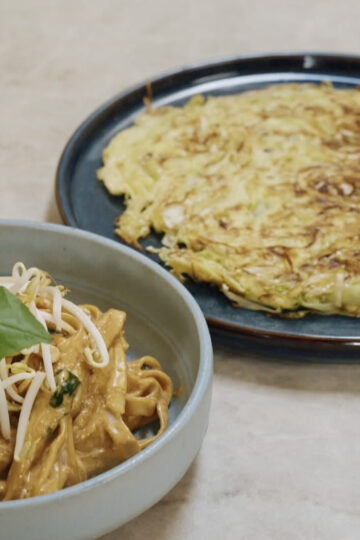 Udon noedels op zijn manier, met een saus van gochujang pasta en sojaroom. En een omelet met groene kool en knapperige pinda’s!