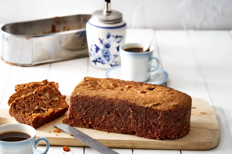 - Meng het bakmeel met het bakpoeder, de basterdsuiker, koekkruiden, sinaasappelrasp en 1⁄2 theelepel zout. Roer de melk en het sinaasappelsap erdoor en roer tot een dik beslag. Meng de noten en zachte rozijnen erdoor en schep het beslag in de vorm.