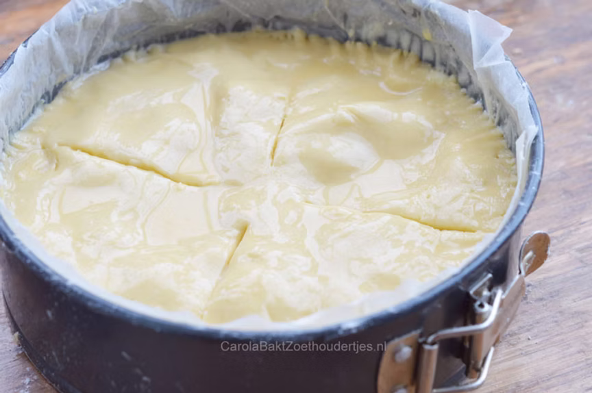 Verwarm de oven voor op 170 graden (heteluchtoven) en vet je bakvorm in. De vorm moet van metaal of email zijn, omdat de de taart dan snel verwarmt wordt.