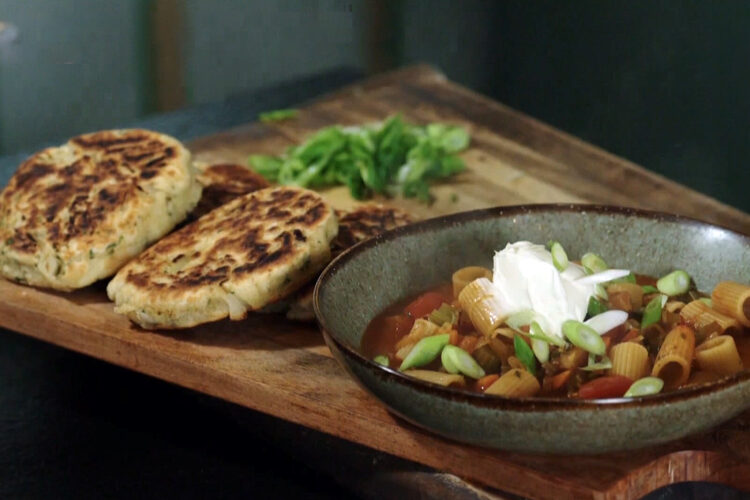 Deze geurige Italiaanse soep met groenten en pasta vormt een heerlijk duo met warme knoflookbroodjes uit de pan.