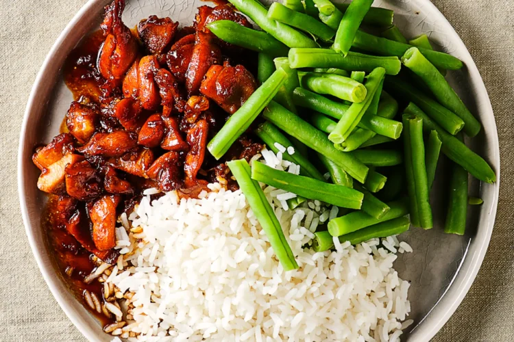 • Serveer de ketjap-kip met de rijst en de sperziebonen.