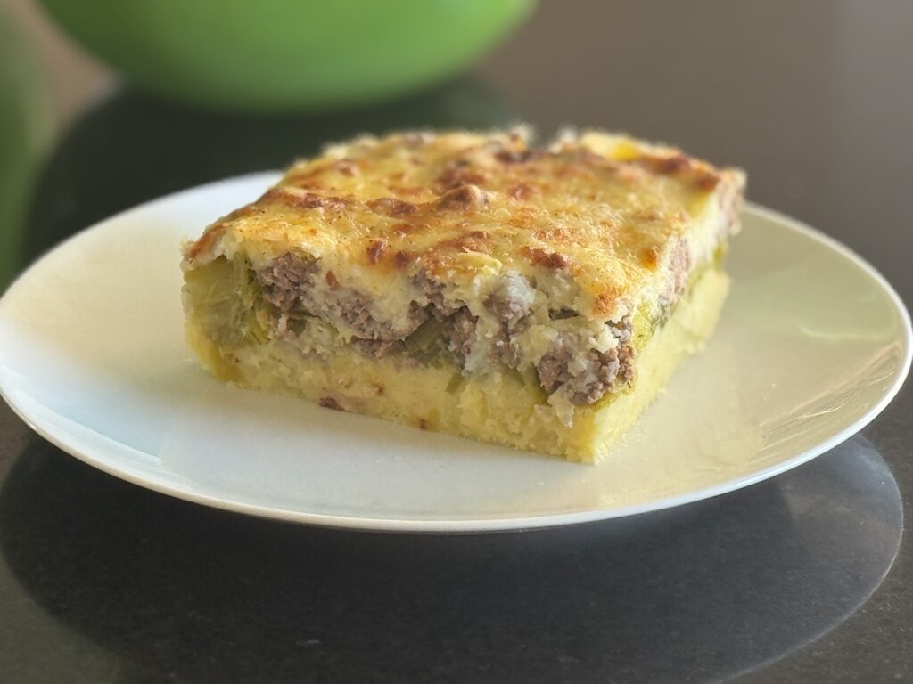 Een typisch Vlaamse ovenschotel met gehakt, prei, aardappelpuree en kaassaus.