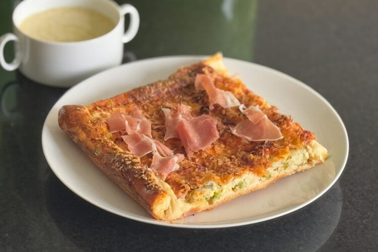Een echt lentegerecht: een plaattaart van witte asperges, met ham een eitje en oude kaas. Smullen maar!