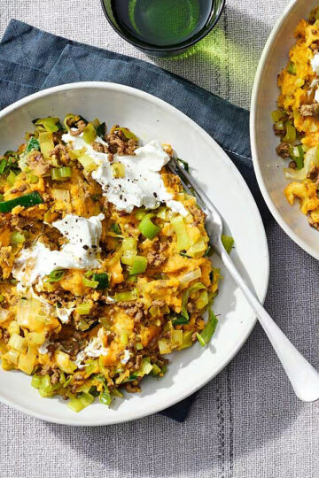 Zoete-aardappelstamppot met prei, geitenkaas en walnoten