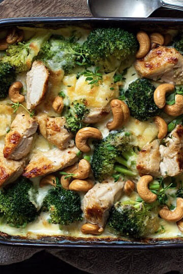 Deze Kip-brie ovenschotel is een heerlijke combinatie van malse kip, romige brie en knapperige cashewnoten.