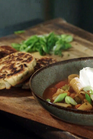 Deze geurige Italiaanse soep met groenten en pasta vormt een heerlijk duo met warme knoflookbroodjes uit de pan.