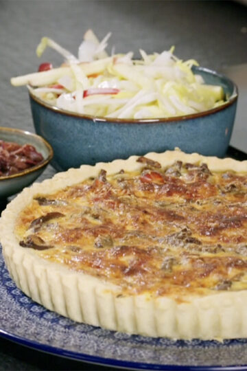 Een heerlijke hartige taart vol herfstsmaken. Met knapperig deeg en een heerlijk romige vulling van bospaddenstoelen, prosciutto en crème fraîche. En om het af te maken een frisse witlofsalade en ui in balsamico.